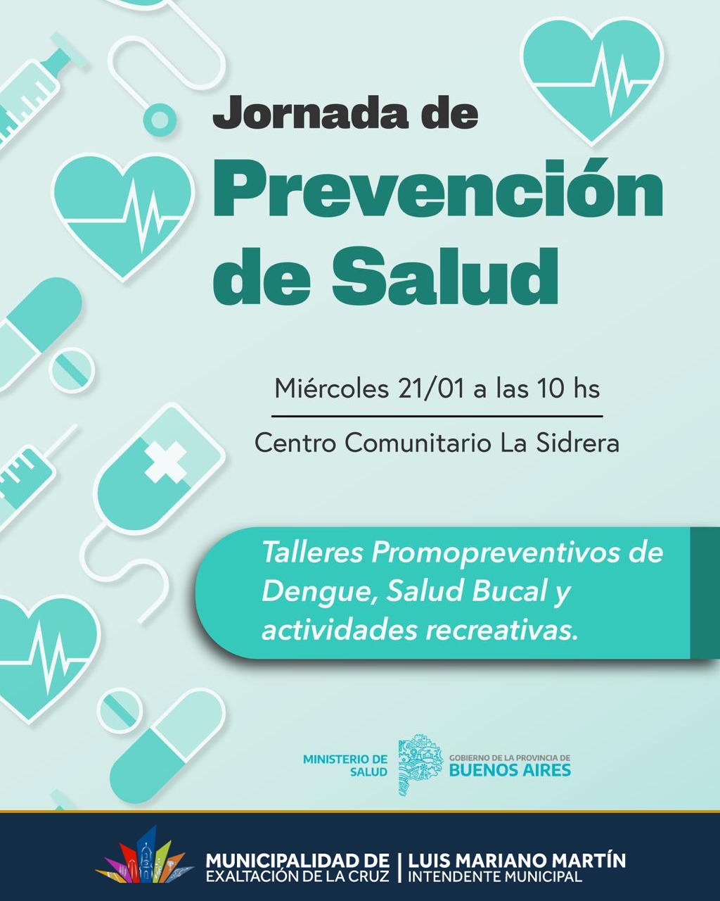 El evento es organizado de manera conjunta por el Ministerio de Salud de la Provincia de Buenos Aires y la Municipalidad de Exaltación de la Cruz, bajo la gestión del intendente Luis Mariano Martín. Se invita a todos los vecinos a acercarse y participar de esta propuesta libre y gratuita.