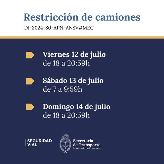 RESTRICCIÓN EN RUTAS NACIONALES PARA CAMIONES POR EL INICIO DE LAS VACACIONES DE INVIERNO
