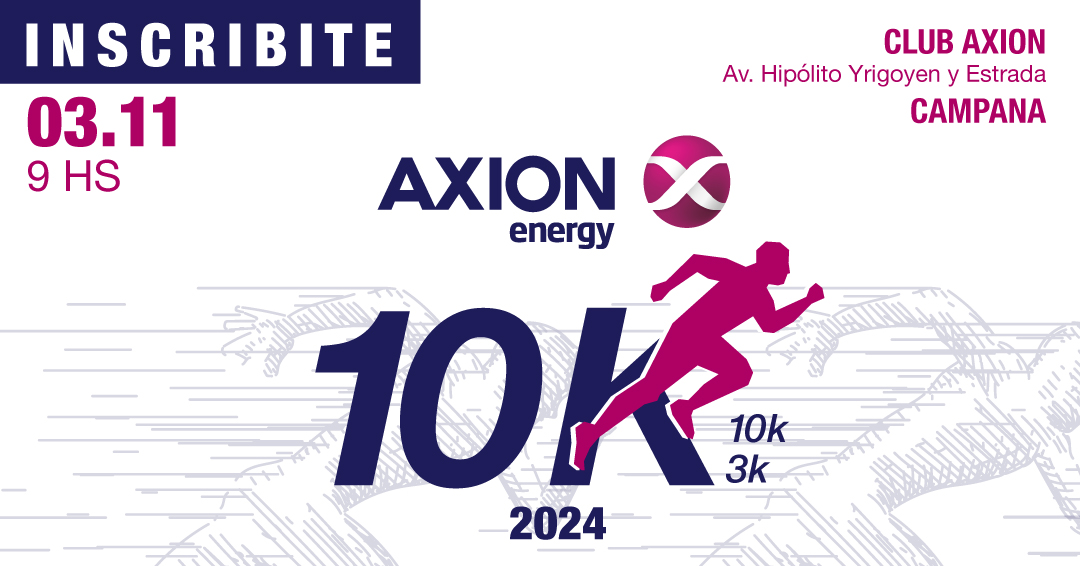 AXION energy 10K vuelve el 3 de noviembre. Inscribite gratis y doná 1 kg de alimento no perecedero. Participá en los circuitos de 3K o 10K y apoyá a instituciones locales. ¡No te lo pierdas!