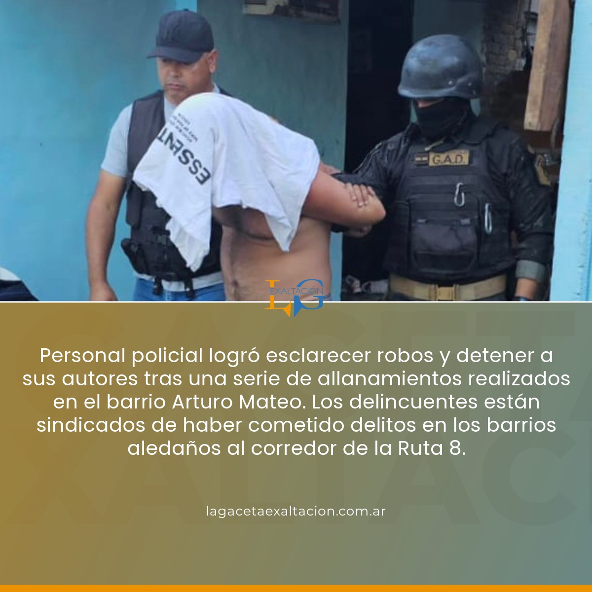 Personal policial logró esclarecer robos y detener a sus autores tras una serie de allanamientos realizados en el barrio Arturo Mateo.